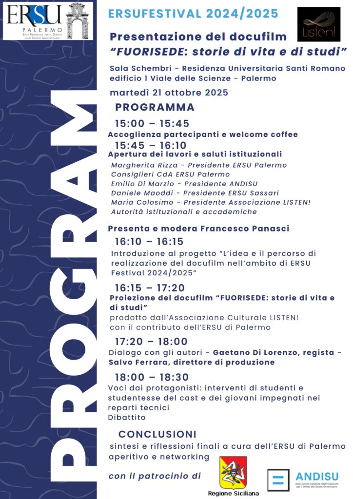 Domani 21 ottobre 2025, alle ore 15:45, presentazione a Palermo, presso la residenza universitaria Santi Romano in viale Delle Scienze, del film prodotto dall’associazione Listen! dal titolo “Fuorisede: Storie di vita e di studi”, con il contributo economico di ERSU Palermo e i patrocini di ANDISU (Associazione nazionale organismi per il diritto allo studio universitario) e della Regione Siciliana.
