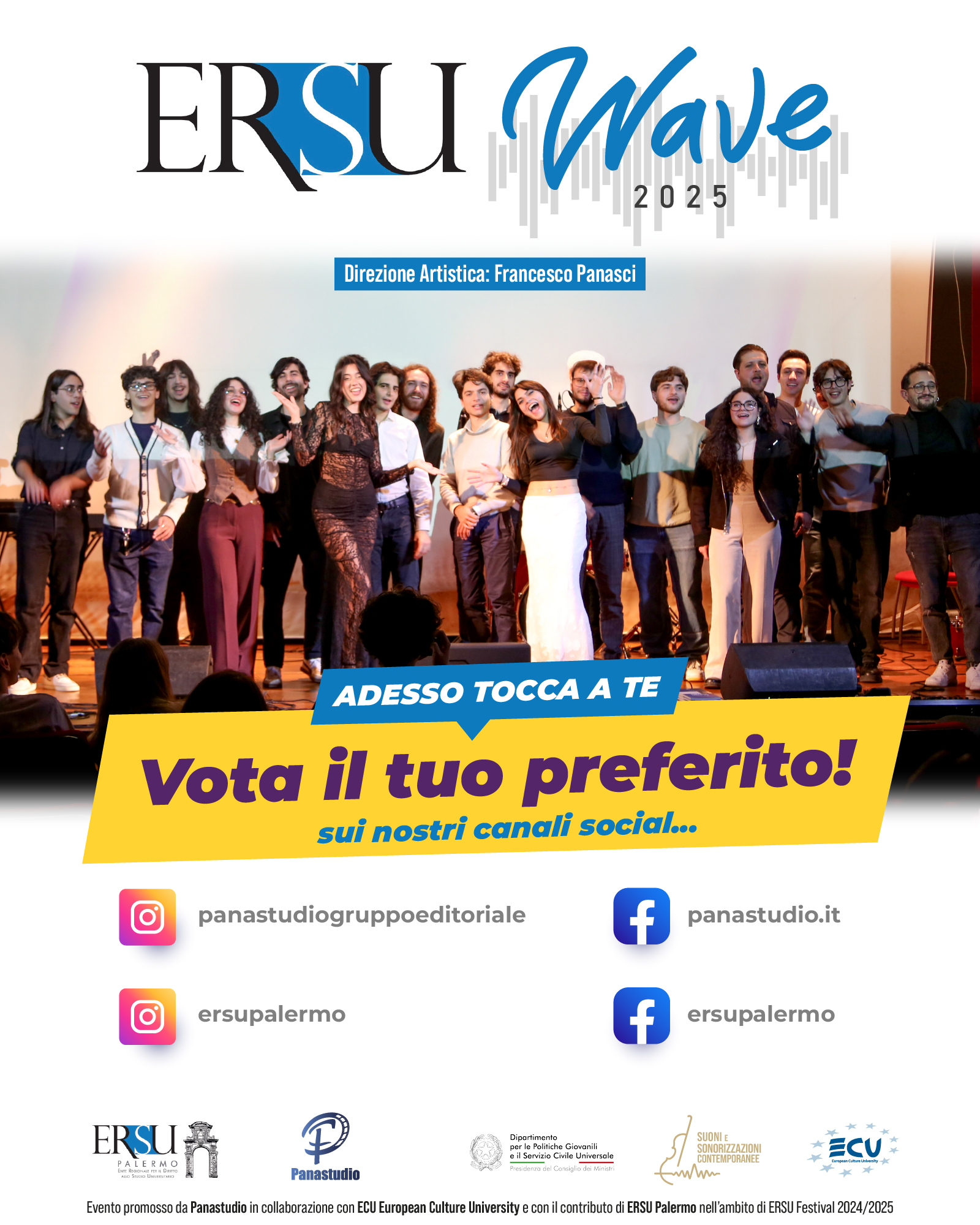 La votazione partirร  il 30 ๐๐ข๐œ๐ž๐ฆ๐›๐ซ๐ž ๐Ÿ๐ŸŽ๐Ÿ๐Ÿ“ alle ore 12:00e si terrร  sulle piattaforme social di Panastudio Productions e ERSU Palermo: